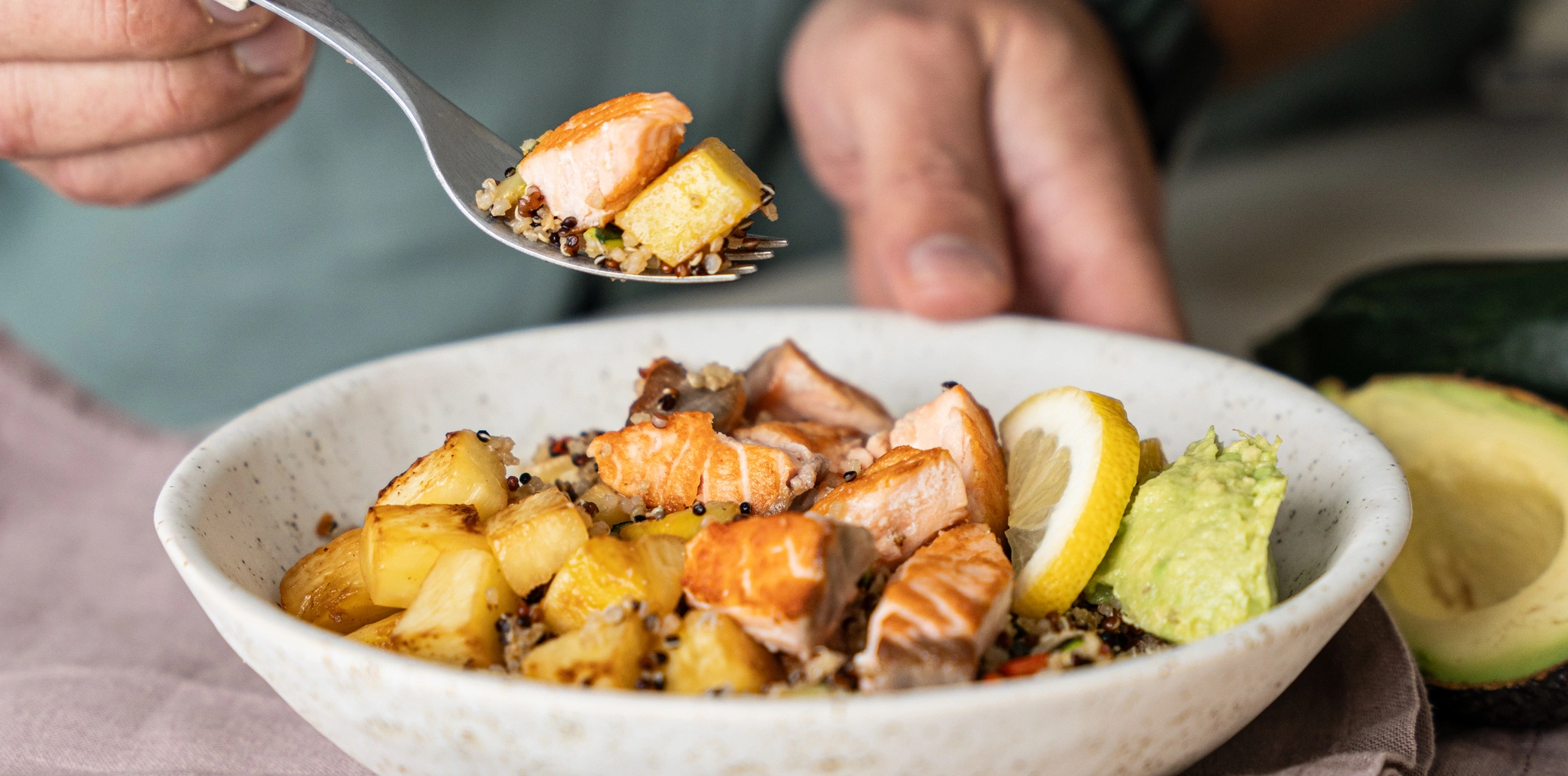 O Bowl de Salmão é rico em vitamina C, zinco e ómega-3, nutrientes que apoiam a defesa do organismo. Assim, a vitamina C proveniente do pimento e do abacaxi contribui para reduzir o cansaço e proteger as células. O magnésio da quinoa apoia o sistema nervoso e o equilíbrio energético, enquanto os ómega-3 do salmão atuam contra inflamações e promovem bem-estar mental. Além disso, a bromelaína do abacaxi ajuda na digestão e no alívio de desconfortos intestinais. No conjunto, este prato fortalece imunidade, vitalidade e serenidade.
