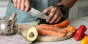 - Salmão fresco — fonte de ómega-3, apoia a saúde cardiovascular e contribui para reduzir inflamações.