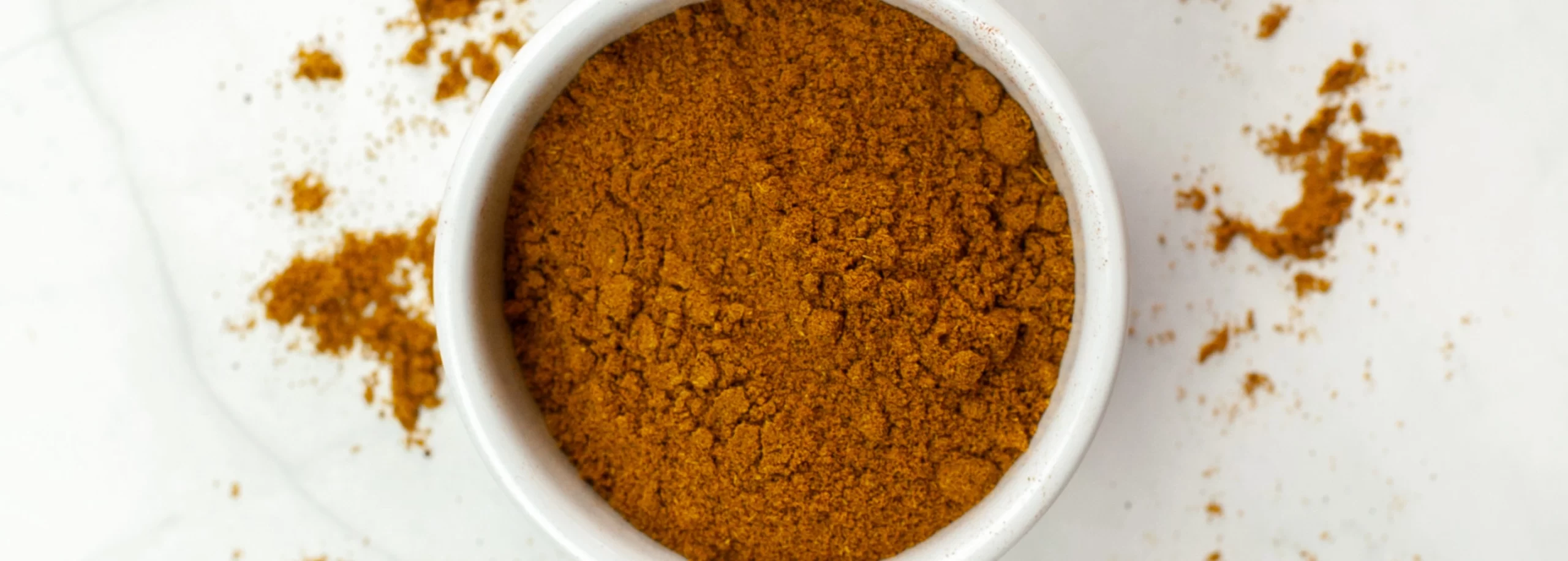 Curcuma, semente de coentro, cominho, caiena, gengibre, canela, cardamomo, cravinho, noz-moscada, pimenta branca, pimenta da Jamaica, pimenta preta e mostarda.