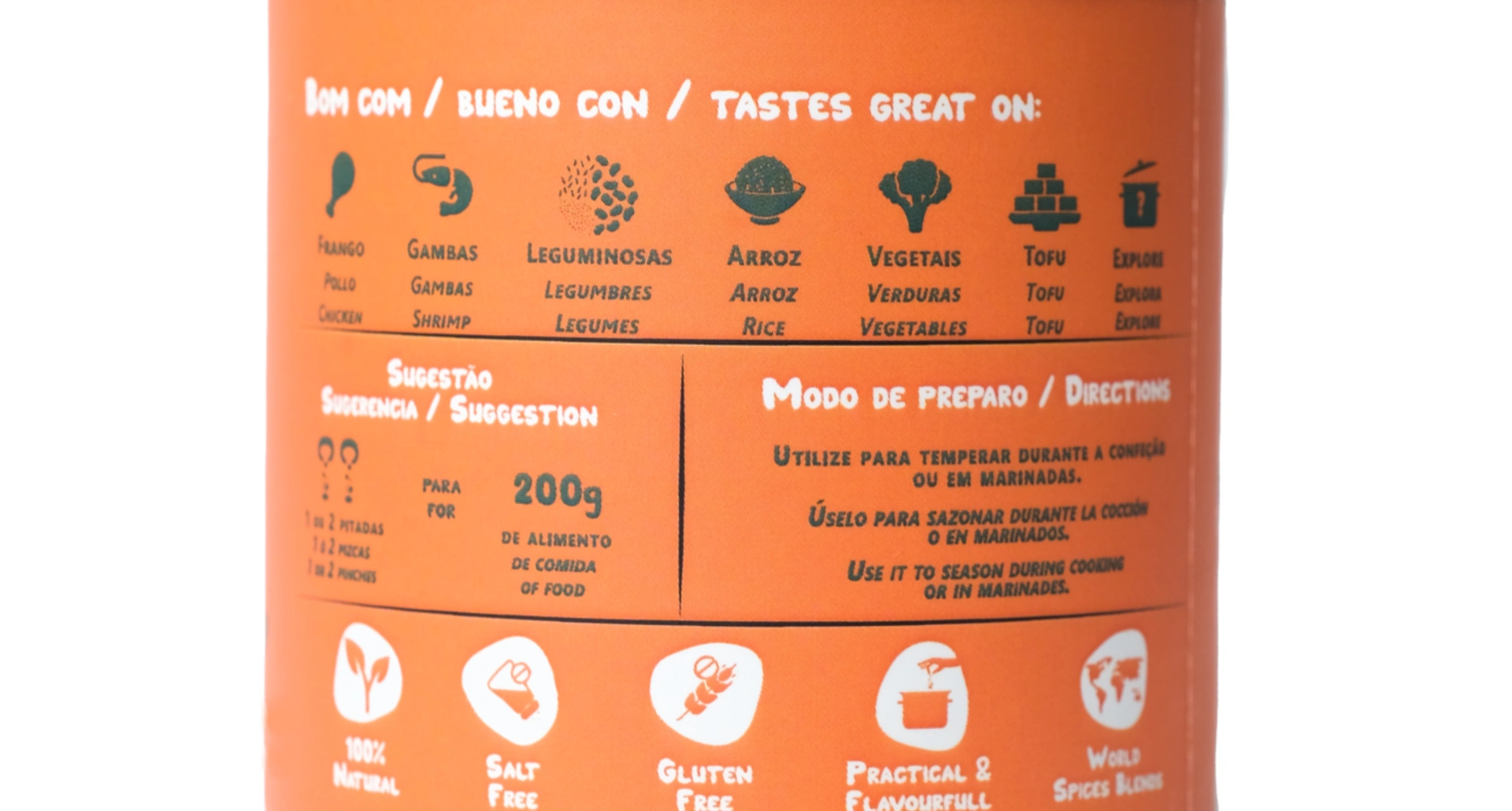 Aplicar 1 ou 2 pitadas sobre cada 200 g de alimento, em marinada, durante o