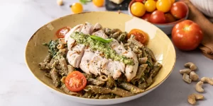 O Frango al Pesto é uma refeição saudável e funcional, pensada para quem procura foco, clareza mental e energia estável ao longo do dia. Inserido na linha Focus Fuel, combina peito de frango braseado e suculento com penne integral, espinafres frescos e tomate cherry. Assim, cada garfada oferece sabor e equilíbrio. Além disso, o prato é envolvido num pesto aromático de manjericão, cajus e parmesão, o que acrescenta intensidade e frescura. Portanto, esta combinação transforma-se numa refeição completa, prática e cheia de funcionalidade. Em seguida, o resultado final é simples: energia estável e foco duradouro para dias de exigência. Por fim, é uma escolha inteligente para quem valoriza saúde e desempenho ao mesmo tempo.