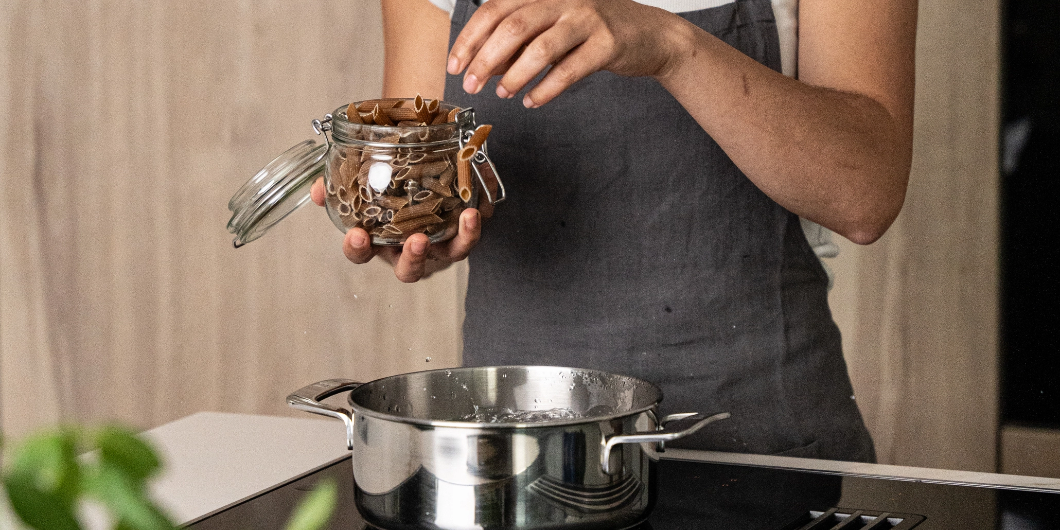 - Penne integral — hidratos de carbono complexos que libertam energia gradualmente. Portanto, ajudam a manter concentração e estabilidade ao longo do dia.