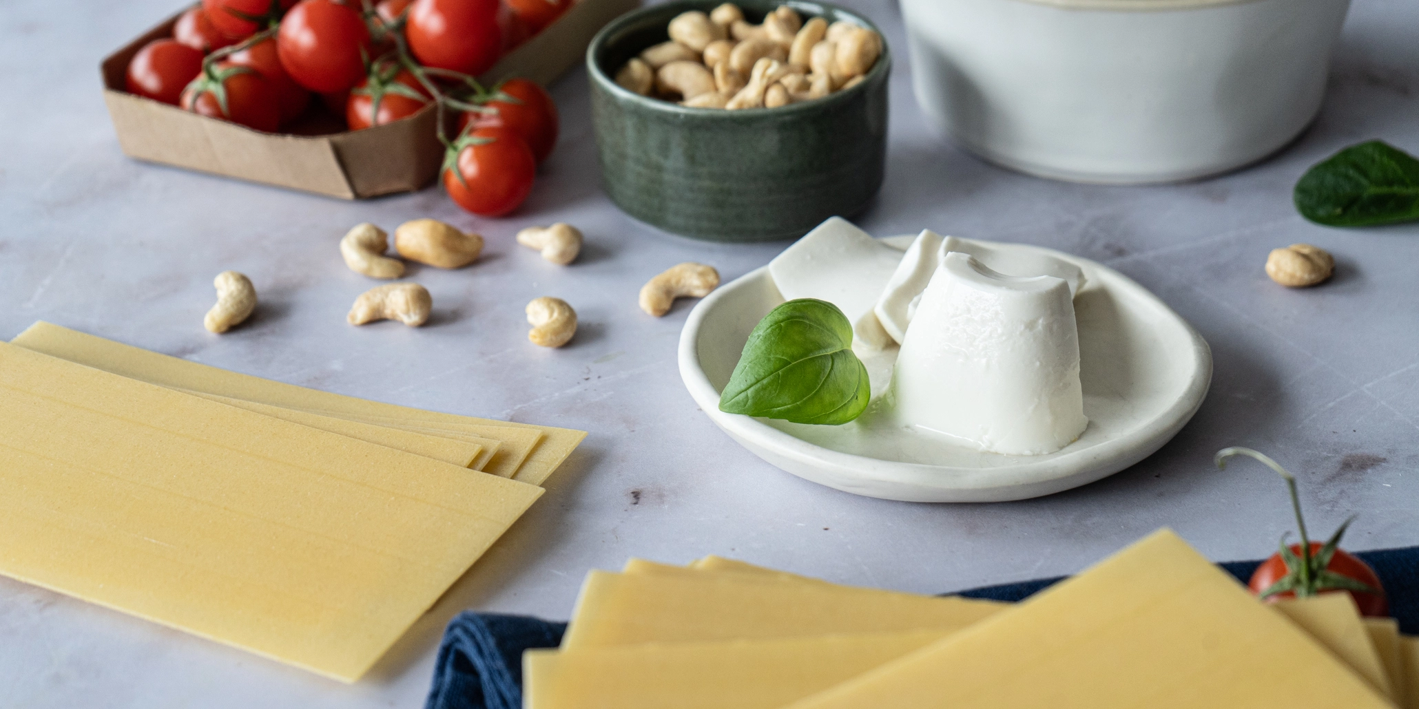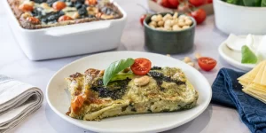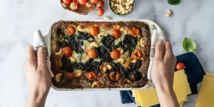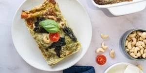 Lasanha caprese: Massa de lasanha integral, mozzarela light, bebida vegetal de soja, espinafres, cebola, cajus, manjericão, queijo fresco, queijo parmesão, azeite, alho, creme vegetal e tomate cherry.