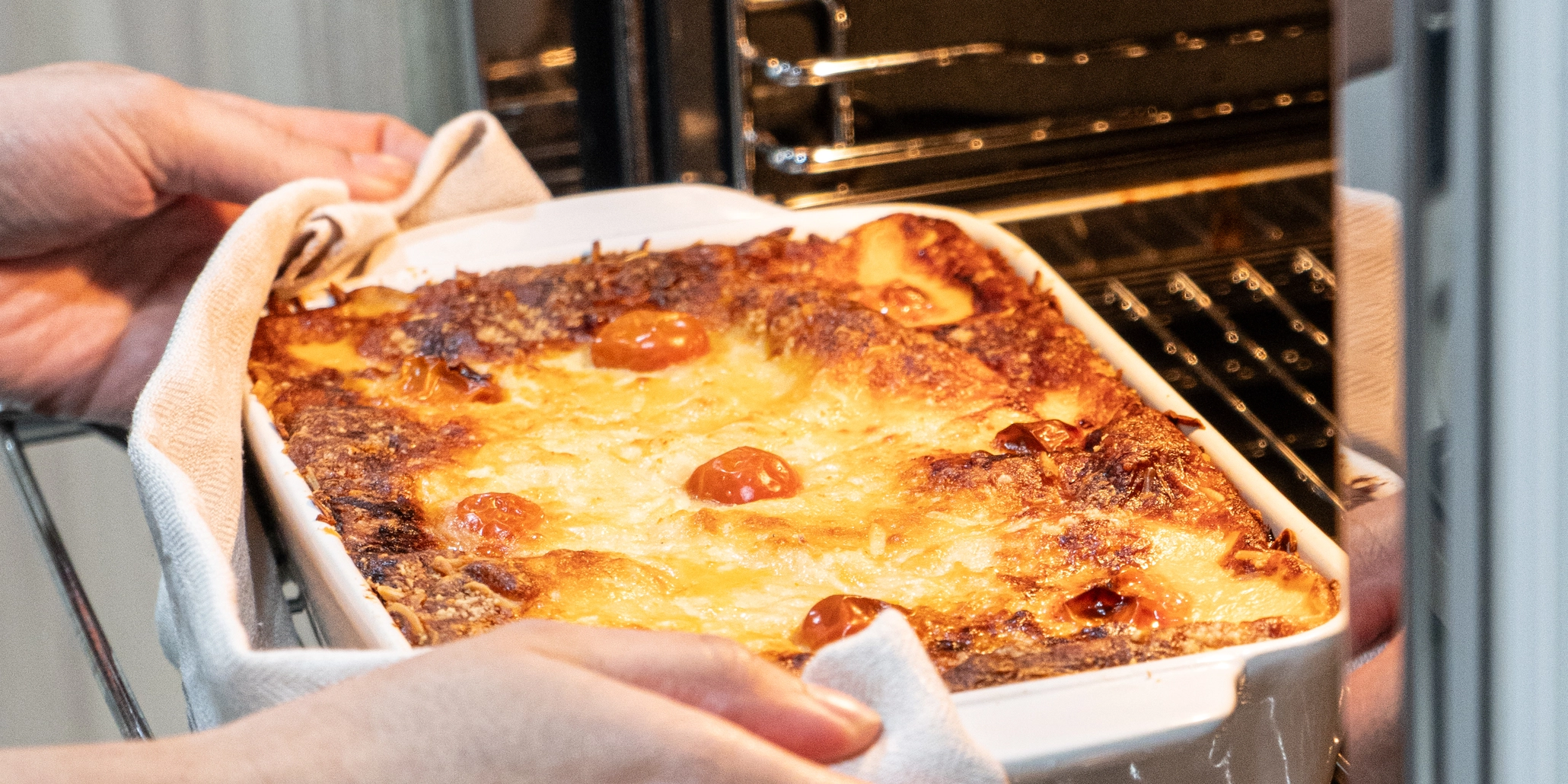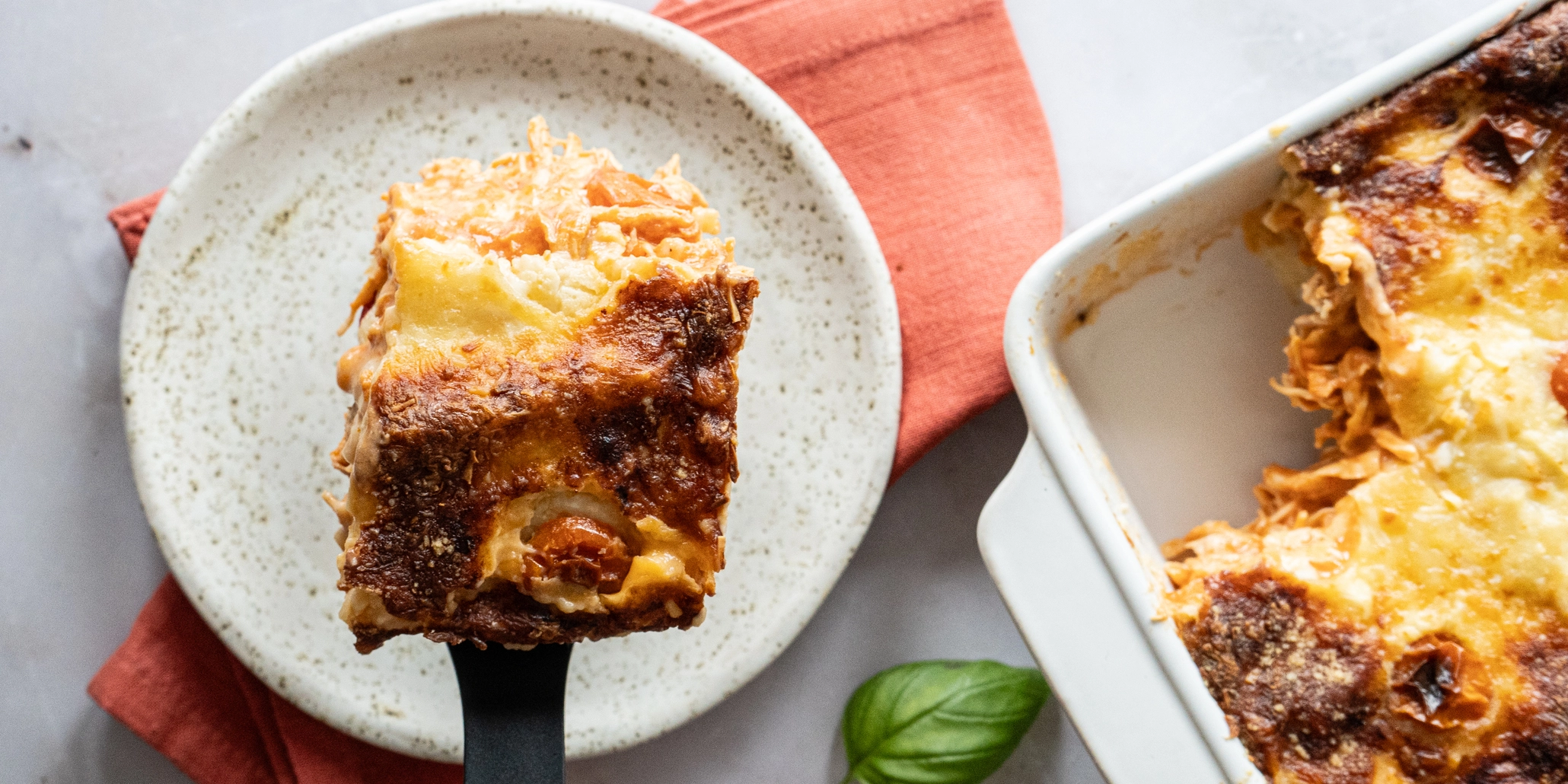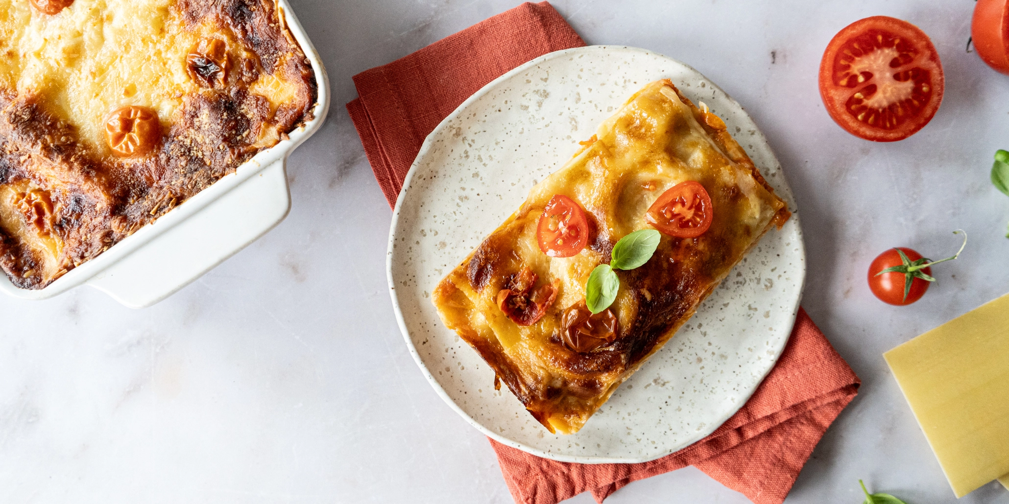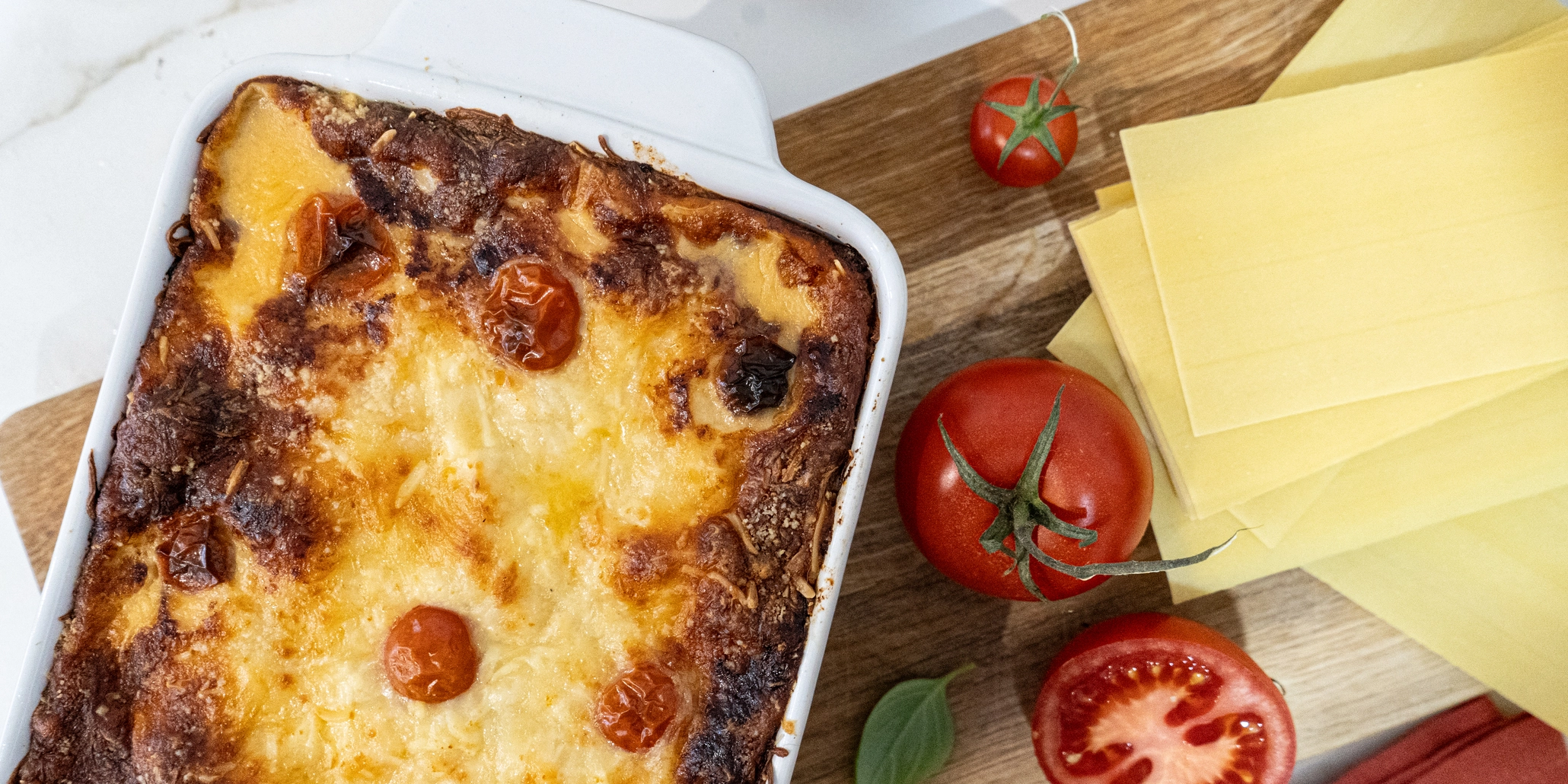 Lasanha de frango: frango a vapor, queijo mozzarela light, caldo de frango caseiro, massa de lasanha, molho de tomate caseiro, cenoura, alho francês, aipo, tomate cherry, bebida vegetal, farinha de trigo, creme vegetal, creme de soja, vinho branco, sal e oregãos.